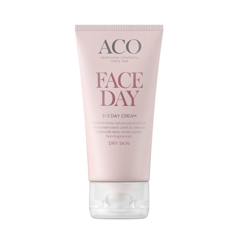ACO Face 3+3 Day Cream är en dagkräm som ger en direkt återfuktning till huden. Hyn blir mjuk och spänstig. 3+3 Day Cream innehåller tre återfuktande ämnen och tre naturliga oljor. Dessa är noga utvalda i syfte att återfukta huden på djupet. För torr hy. Parfymfri.
