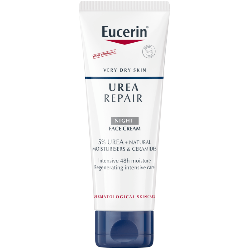 Eucerin Urea Repair Night Face Cream 5% Urea är en återfuktande nattcreme som vårdar intensivt upp till 48 timmar. Den unika formulan innehåller 5% Urea (karbamid) + naturliga fuktgivare samt ceramider som förbättrar hudens förmåga att binda vatten vilket resulterar i ökad fuktmängd.Kliniska och dermatologiska studier visar: Mycket god effekt och hudkompatibilitet testad på mycket torr hud. Den intensiva nattcremen återfuktar omedelbart och minskar torrhet och stramhet så att huden känns len och smidig. Nattcreme som vårdar intensivt upp till 48 timmar.Återfuktar omedelbart och minskar torrhet och stramhet i huden.Huden känns len och smidig.Stärker hudens naturliga barriär.Utan parfym.