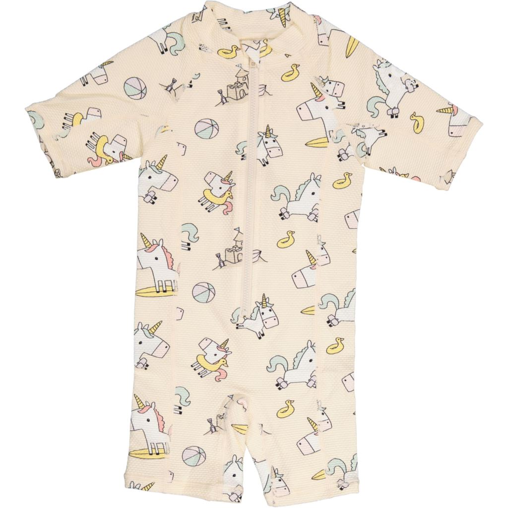 Geggamoja UV-dräkten i färgen Beige Unicorn har en stilren och söt design som barnen kommer att älska. Den har en vacker enhörningsmönstertryck som ger den en extra touch av charm. Dräkten finns i olika storlekar för att passa barn i olika åldrar.