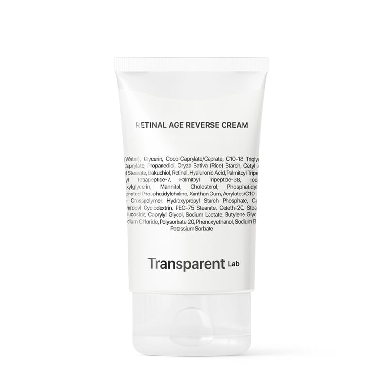 Retinal Age Reverse Cream är Transparent Labs mest innovativa anti-aging-formula hittills. En kraftfull anti-agingkräm som kan stimulera cellförnyelse och kollagenproduktion för att motverka rynkor och uttryckslinjer och bekämpa alla synliga tecken på åldrande.Retinal Age Reverse Cream innehåller fyra kraftfulla aktiva anti-aging-ingredienser som hjälper dig att vända tidens gång. Icke-irriterande Retinal som har visat sig vara den mest effektiva formen av A-vitamin, högpenetrerande hyaluronsyra, anti-agingpeptider och bakuchiol.Resultaten är synliga så snart som efter den första användningen. Upptäck föryngrad och balanserad hud, nu möjligt tack vare denna högpresterande anti-agingkräm!För mogen, glåmig hud som passar alla hudtyper. PH: 5.00–5.40