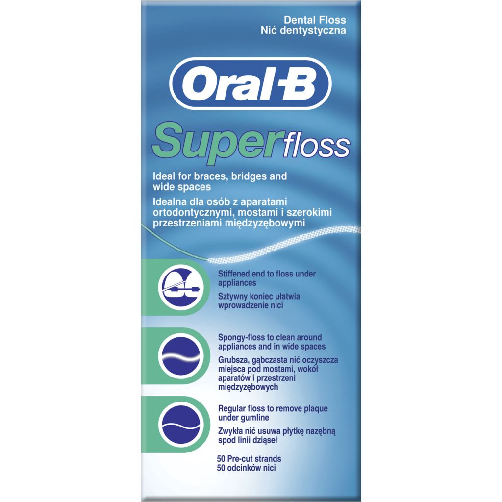 - Effektiv rengöring: Oral-B Super Floss tandtråd är utformad med tre olika delar för att ge en grundlig rengöring. Den första delen är en styv ände som kan användas för att enkelt tråda in tandtråden mellan tänderna och tandställningen. Den andra delen är en spongy del som effektivt tar bort plack och matrester. Den tredje delen är en vanlig tandtråd som kan användas för att rengöra resten av tänderna. - Skonsam mot tandköttet: Oral-B Super Floss tandtråd är skonsam mot tandköttet och minskar risken för irritation och blödningar. Den spongy delen av tandtråden är mjuk och flexibel, vilket gör att den anpassar sig efter tandställningen och tandköttet utan att skada dem. - Praktisk förpackning: Oral-B Super Floss tandtråd levereras i en praktisk förpackning med 50 stycken tandtrådar. Detta gör det enkelt att ha med sig tandtråden överallt och använda den när det behövs.